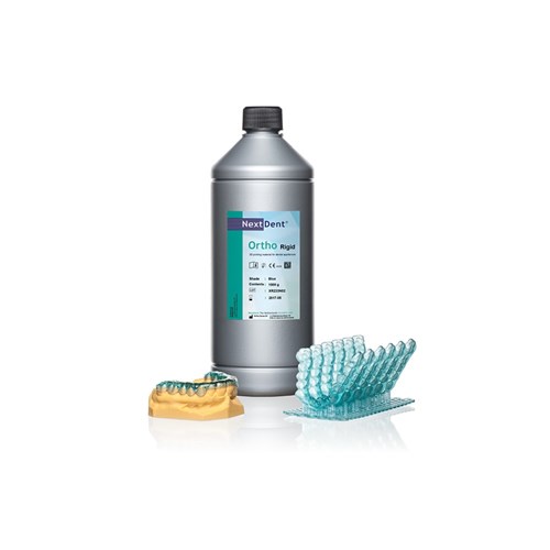 Easily design and 3D print splints NextDent Ortho Rigid is a biocompatible Class IIa material developed for digital manufacturing of splints. In combination with suitable software, it is possible to easily design and print splints. Available in Transparent Blue.