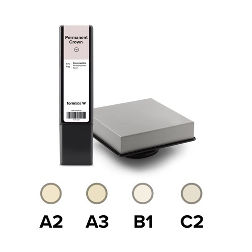 Permanent Crown Resin is a tooth-colored, ceramic-filled resin for 3D printing of permanent single crowns, inlays, onlays, and veneers. Permanent Crown Resin produces high strength, long term restorations with an accurate and precise fit. Low water absorption and a smooth finish ensure restorations made from Permanent Crown Resin have a low tendency to age, discolor, or accumulate plaque. Available in four VITA* shades (A2, A3, B1, C2). A Stainless Steel Build Platform is required when printing with Permanent Crown Resin for optimal aesthetics and performance. We recommend purchasing the Permanent Crown Resin Starter Pack if you do not currently have a Stainless Steel Build Platform. Supports print resolutions: 50 microns. Post-curing required.