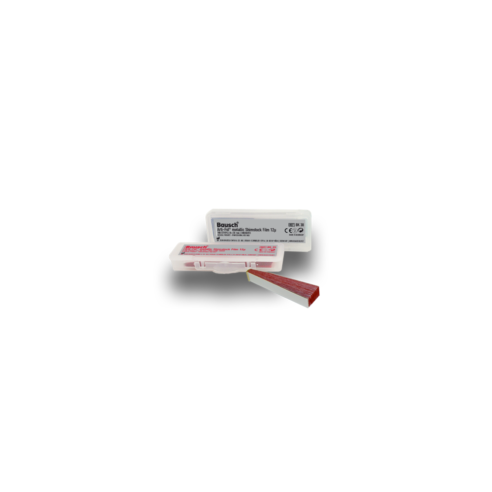 Arti-Fol®12µ metallic is a high-tech test film with distinctly improved features. This test film is made of metallic polyester film (Shimstock-film) only 12µ thick. The combination of a newly created color coating and a metallic film offers certain advantages in some applications. This film possesses excellent color transfer. High spots can easily be detected, especially on ceramic or highly polished metal surfaces. The film is antistatic and can easily be applied even without using forceps. It is also extremely tear-resistant and ideal for resilience testing. In contrast to the conventional Shimstock film this Arti-Fol®metallic marks the respective high spot precisely. Since the back of the film is metallic, it is obvious which side is color coated and which is not. Arti-Fol® metallic is tear-resistant and only 12µ thick. It is therefore ideal for checking approximal contact points when fixing dental bridges and crowns. This test film can easily be applied using the Arti- Fol®forceps BK 145 for interproximal contacts. Arti-Fol®metallic comes in four different colors.