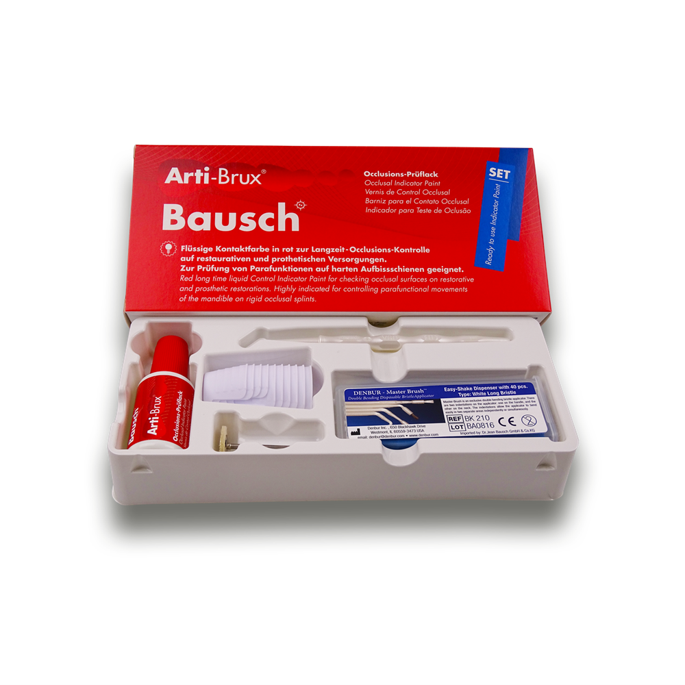 Arti-Brux® is a red indicator paint which is applied with a brush (single use product) to the occlusal surfaces to be tested. After drying, Arti-Brux® forms a saliva-resistant, thin and even coating. To diagnose parafunctions (especially bruxism), Arti-Brux® has to be applied to the hard splint. Due to the color abrasions, contact areas become clearly visible.