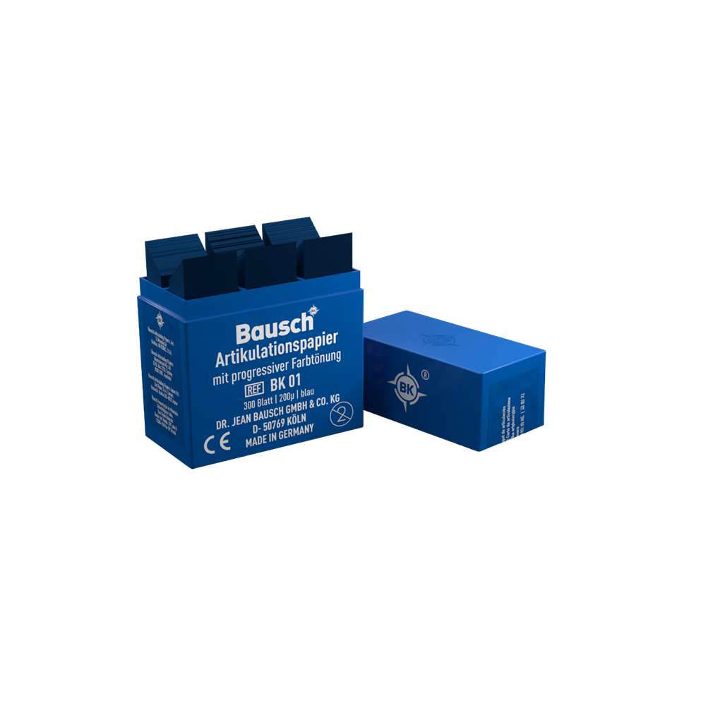 Bausch 200µ Articulating Paper with progressive color transfer can highlight any existing masticatory pressure interference clearly. Thinner test products which are available in thicknesses of up to 8µ (Arti-Fol®) should be used after adjusting and localizing the problem area.