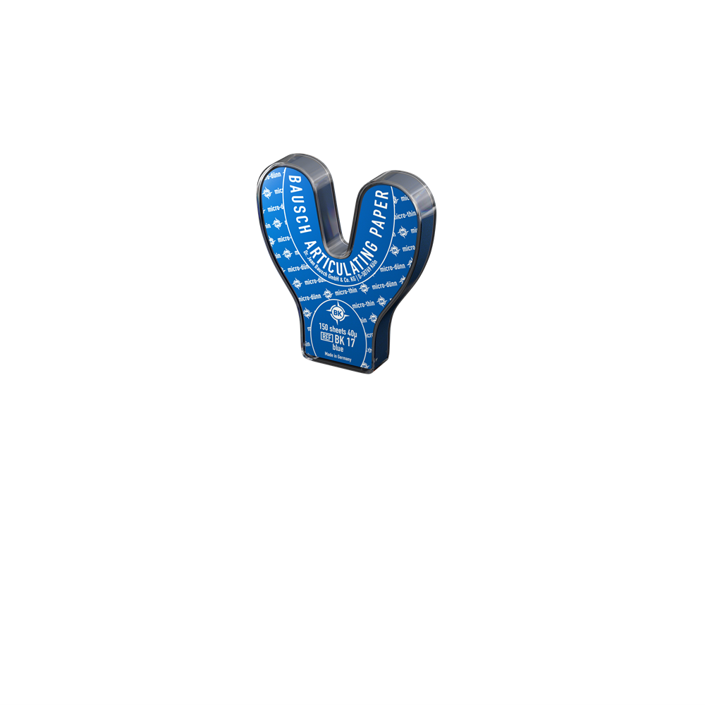 Bausch micro-thin Articulating Papers are especially suitable for the two-tone representation of static and dynamic occlusion. The first step is to inspect the static occlusion in red, and the second step to inspect the dynamic occlusion in blue. The color sequence can, of course, be altered.