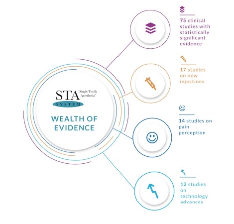 The Wand/STA system is supported by decades of dental research and support the claims of eliminating and markedly reducing pain perception when performing a dental injection.6,7,8,9 This technology has undergone the rigors of being clinically testing in many leading universities and research centers throughout the world for more than two decade.