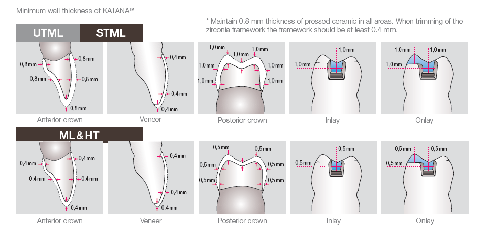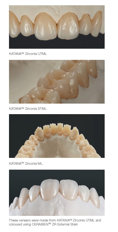Zirconia still has a relatively poor reputation in terms of aesthetics due to the extreme whiteness of the earliest examples from the turn of the century. Types of zirconia are now available with varying translucencies, and there are even so-called multi-layer varieties (KATANATM Zirconia ML, STML and UTML by Kuraray Noritake), and these new zirconia no longer have to be porcelain-baked. Obviously, baking is still possible, and partial baking is a choice that is frequently made.