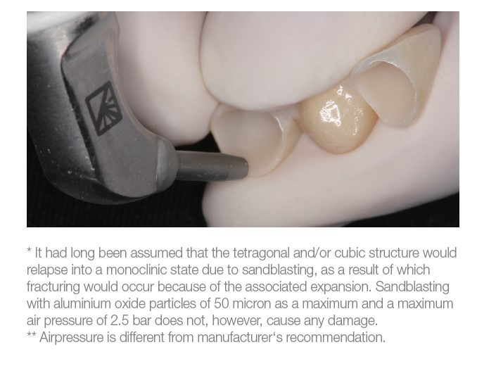 Dentists who want to achieve the durable cementation of their zirconia restorations therefore have no other option than the purchase of a sandblasting device. Sandblasting can be carried out in a small cabin to prevent the surrounding area of the practice from being affected. Soft air abrasion is carried out at 0.5 bar, while tight air abrasion is performed at 2.5 bar. The exact pressure is not all that crucial to the adhesion of the zirconia, providing that it is between 0.5 and 2.5 bar**.
