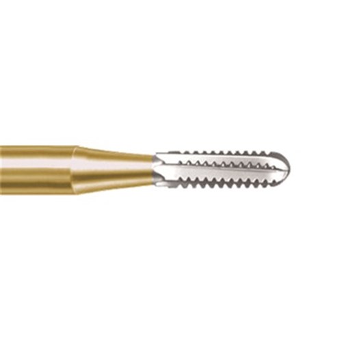 H40 cylinder with round end and cross cut, tungsten carbide cutter for cutting metal crowns. FG 314 shank, size 012 (1.2mm) diameter with 4mm working length. Apply crown remover at 45 degree angle.