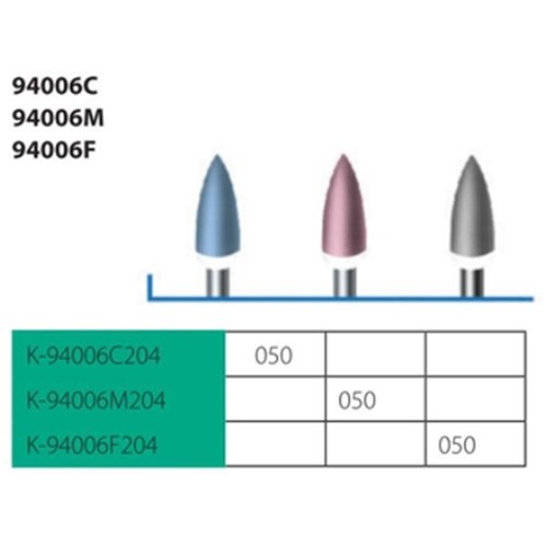 Polishers for ceramics interspersed with diamond grit. Use with spray coolant. Slow speed shank 204 size 050 large point with 10.5mm working length. 3 Step polishing