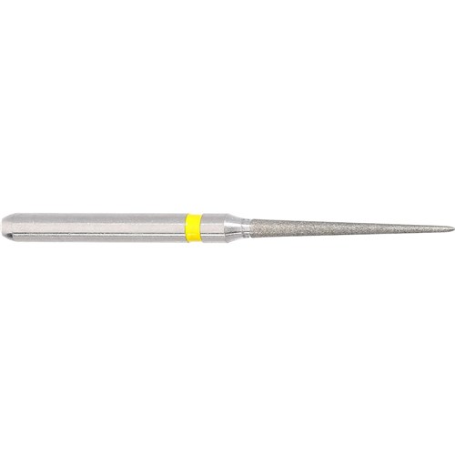 Tapered pointed, extra fine grit, FG 314 diamond, 010 diameter with 11mm working length and 2 degree taper for finishing crown preparation or working on filling material. Matches H135/FS9 carbide finisher series.