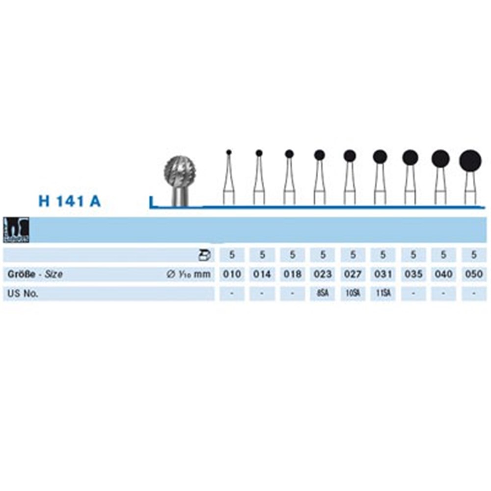 Oral Surgery tungsten carbide, round bone cutter H141A with special cutting design for smooth operation. HP 104 shank for straight surgical handpiece, size 050 (5mm) diameter.