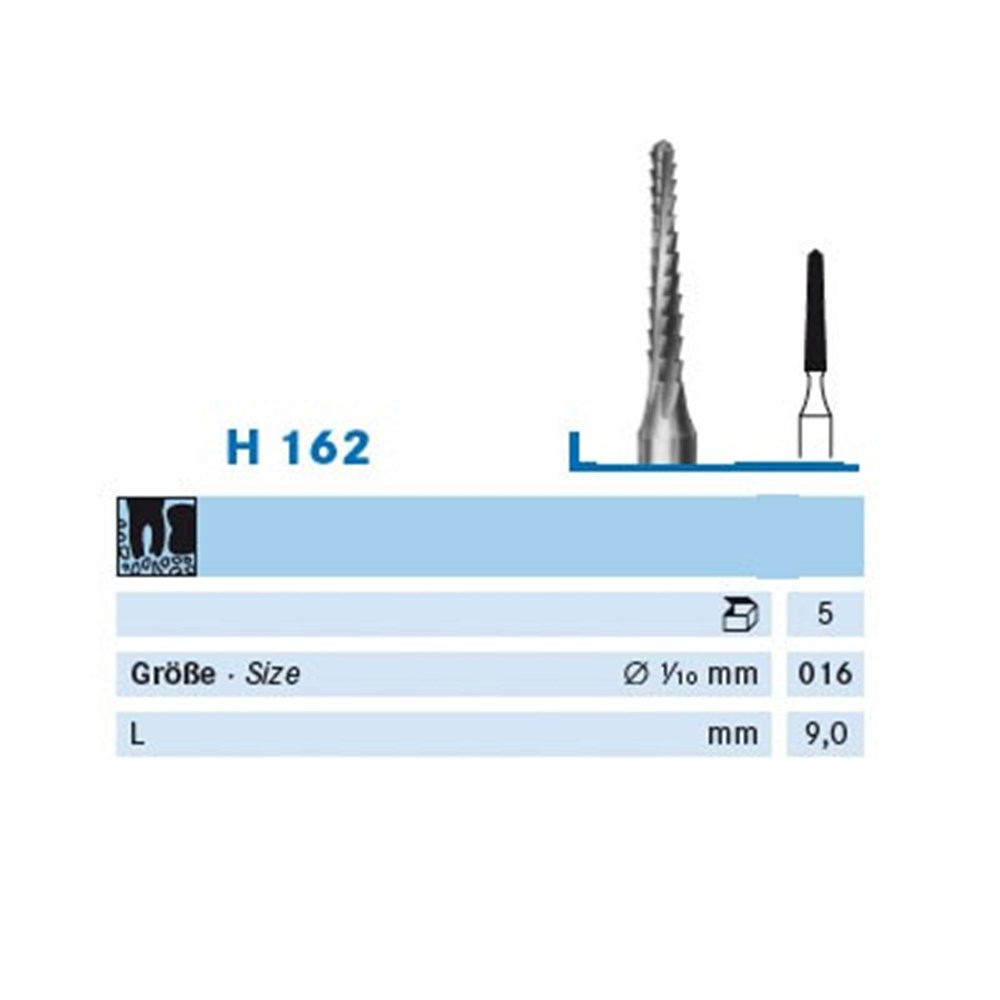 Oral Surgery tungsten carbide, Lindemann bone cutter H162. HP 104 shank for straight surgical handpiece, size 016 (1.6mm) diameter with 9mm working length.