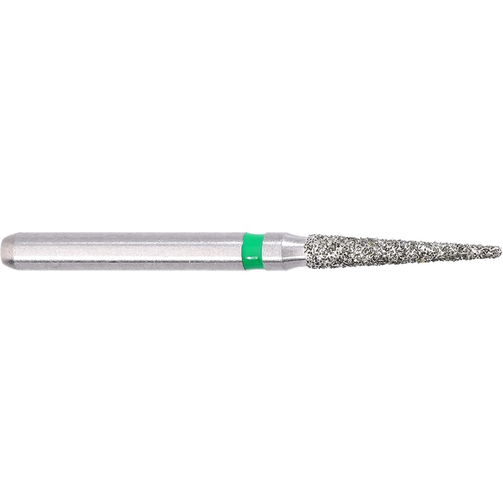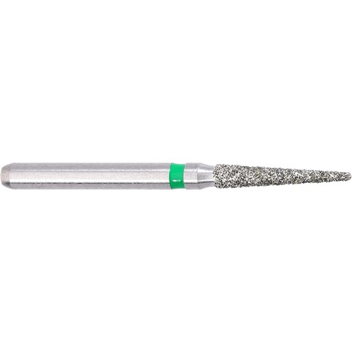 Pointed coarse grit, friction grip diamond. Head diameter 014 (1.4mm) with 3.4 degree angle and working length of 8mm. Maximum recommended speed 300,000 rpm.
