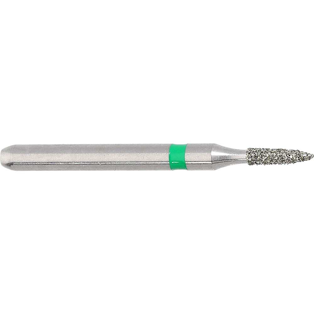Flame short, course grit, friction grip diamond. Head diameter 010 (1.0mm) with working length 4mm. Maximum recommended speed 100,000 rpm.