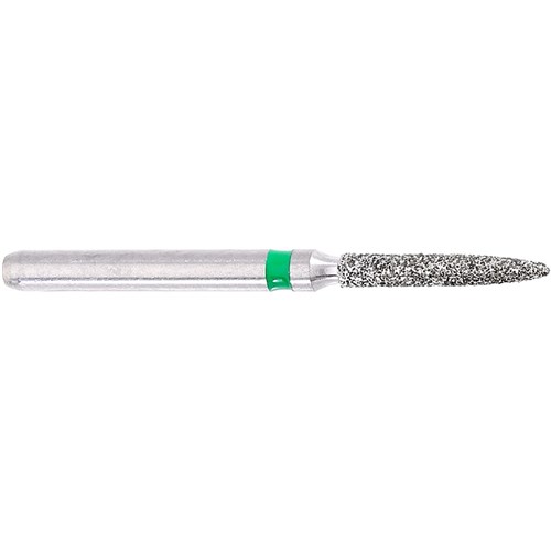 Flame, course grit, friction grip diamond. Head diameter 012 (1.2mm) with 8mm working length. Maximum recommended speed 300,000 rpm. Matches H48L carbide finisher series.