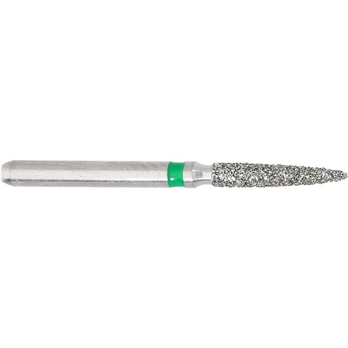 Flame, course grit, friction grip diamond. Head diameter 014 (1.4mm) with 8mm working length. Maximum recommended speed 300,000 rpm. Matches H48L carbide finisher series.