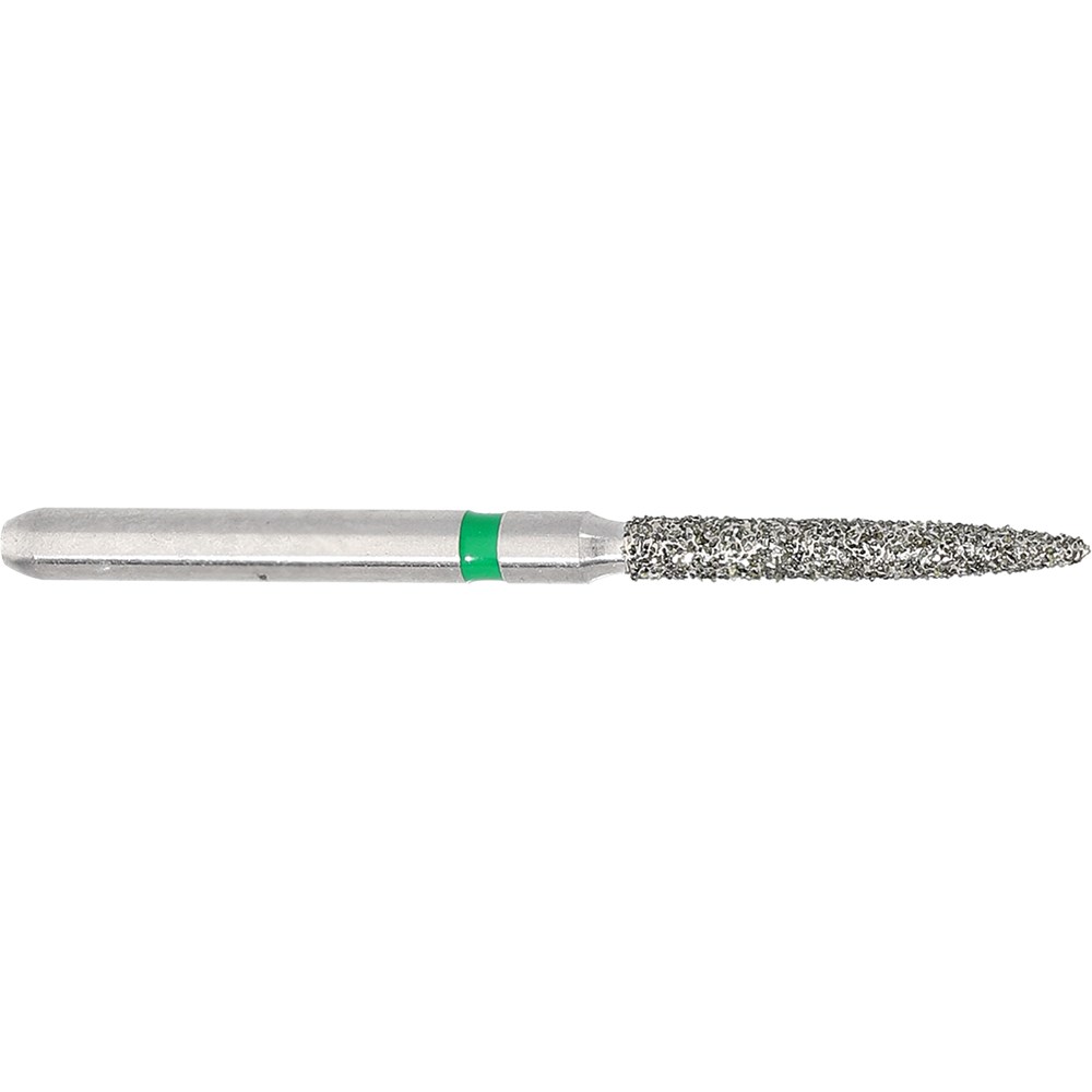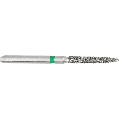 Flame long, course grit friciton grip diamond. Head diameter 014 (1.4mm) with 10mm working length. Maximum recommended speed 300,000 rpm.