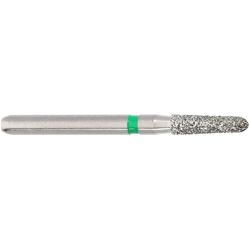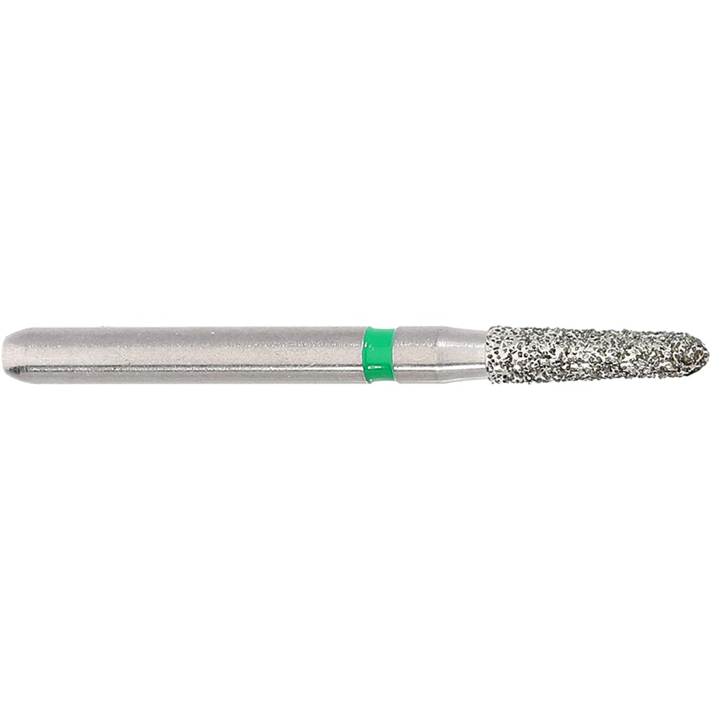 Short tapered chamfer, torpedo, course grit, friction grip diamond. Head diameter 016 (1.6mm) with 2 degree angle and 6mm working length. Maximum recommended speed 300,000 rpm. Matches H282K carbide finisher series