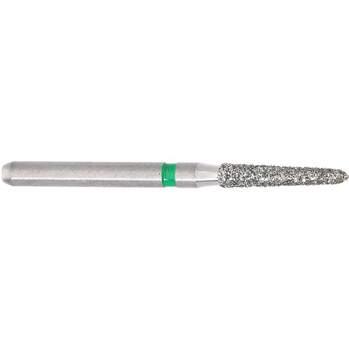 Tapered chamfer, torpedo course grit, friction grip diamond. Head diameter 014 (1.4mm) with 2 degree angle with 8mm working length. Maximum recommended speed 300,000 rpm. Matches H283K carbide finisher series.