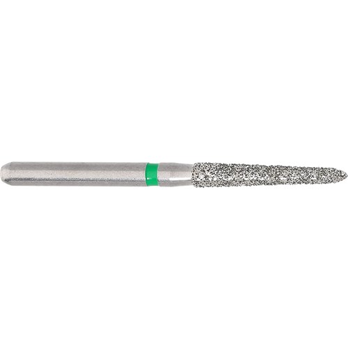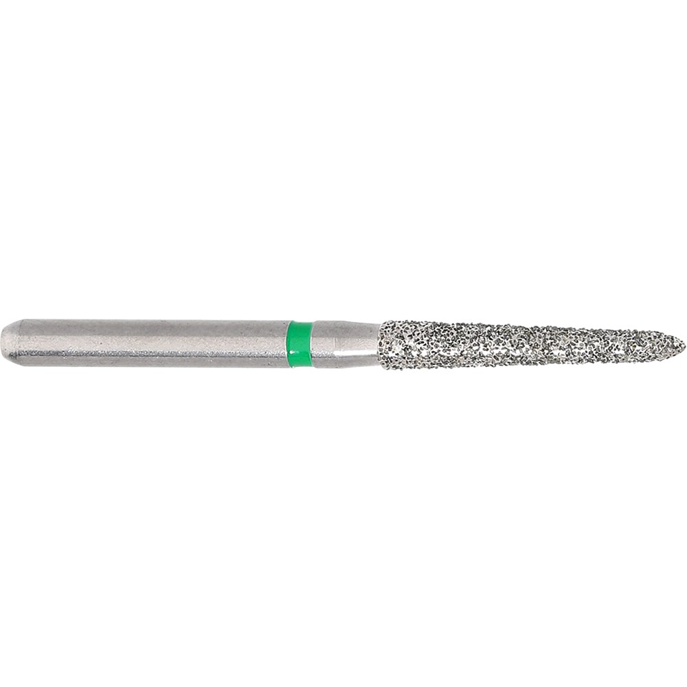 Long tapered chamfer, torpedo course grit, friction grip diamond. Head diameter 016 (1.6mm) with 2 degree angle and 10mm working length. Maximum recommended speed 300,000 rpm. Matches H284K carbide finisher series.