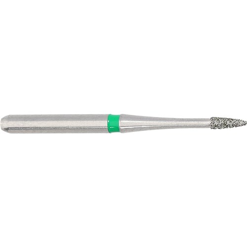 Pointed course grit, friction grip diamond. Head diameter 010 (1.0mm) and 3mm working length. Maximum recommended speed 300,000 rpm.