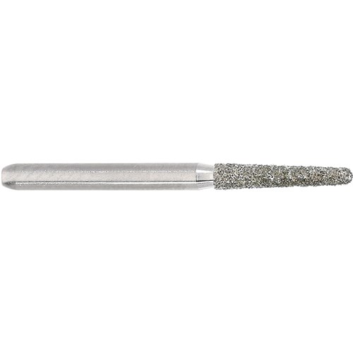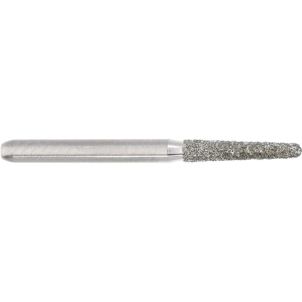 Tapered chamfer, round, medium grit, friction grip. Head diameter 016 (1.6mm) with 2 degree angle and 8mm working length. Matches H375R carbide finisher series.