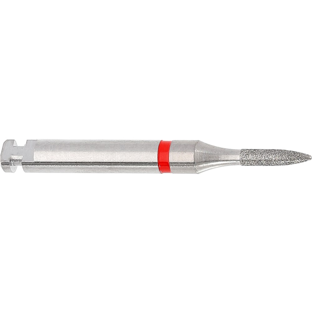 Flame short for finishing crown preparation or working on filling material. Fine grit, RA 204, 012 diameter and 5mm working length