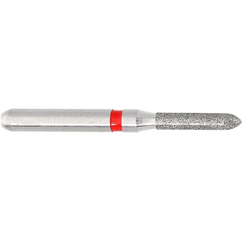 Short parallel chamfer, torpedo finisher for crown preparation or cavity preparation. Fine grit, friction grip short diamond. Head diameter 012 (1.2mm) with 6mm working length. Matches H282 carbide finisher series
