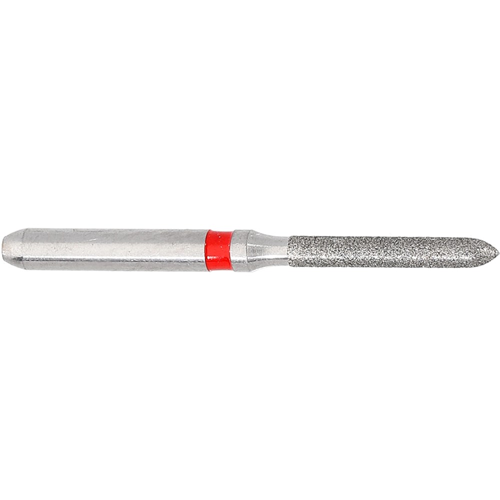 Parallel chamfer, torpedo, fine grit, friction grip short FG 313 diamond finisher for crown preparation. Head diameter 012 (1.2mm) and 8mm working length. Matches H283 carbide finisher series