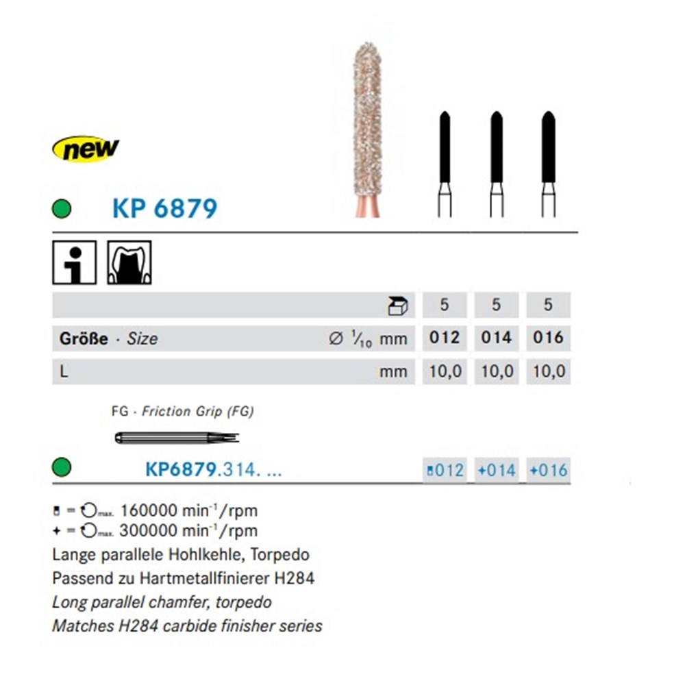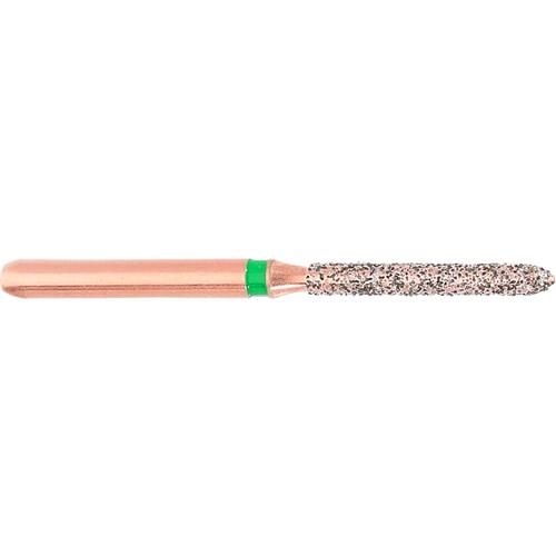 DIAO - KP6879 is a long parallel chamfer, torpedo shaped coarse, friction grip diamond used for crown preparation. Size 014 (1.4mm), with length 10.0mm.