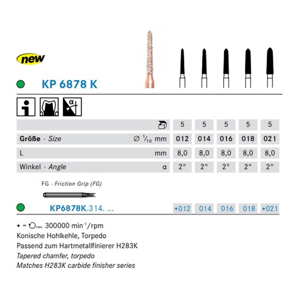 DIAO - KP6880 is a short parallel chamfer rounded edge shaped coarse, friction grip diamond used for crown preparation. Head diameter 014 (1.4mm) and 6mm working length.