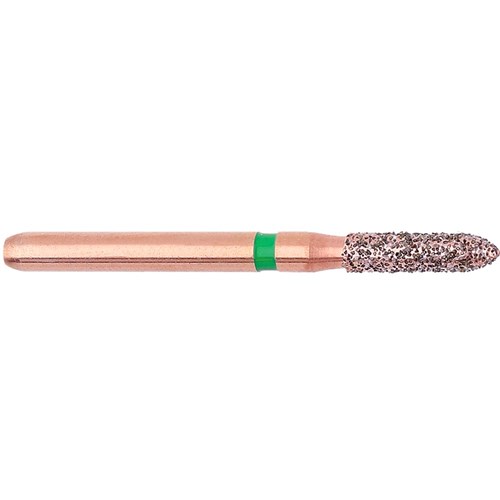 DIAO - KP6877 is a short parallel chamfer, torpedo shaped coarse friction grip diamond used for crown preparation. Head diameter 016 (1.6mm) and 6.0mm working length.