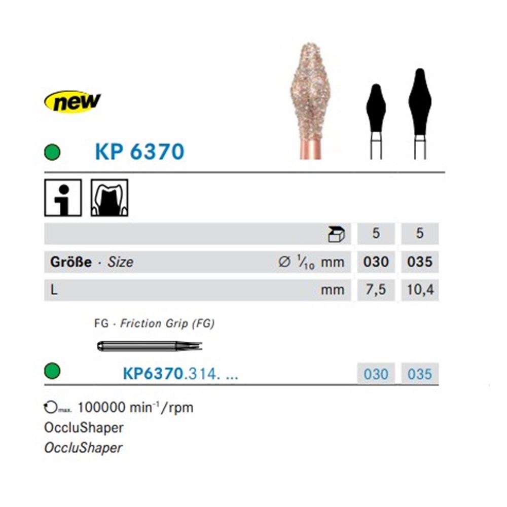 DIAO - KP6370 is an occlu shaped coarse, friction grip diamond used for occlusal contouring in crown preparations. FG 314 Size 035 with length of 10.4mm.