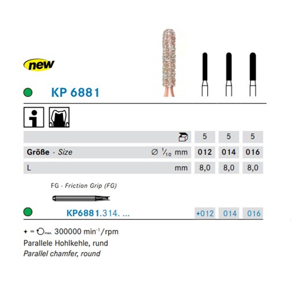 DIAO - KP6881 is a parallel chamfer rounded edge shaped coarse, friction grip diamond used for crown preparation. Head diameter 016 (1.6mm) with length 8.0mm.