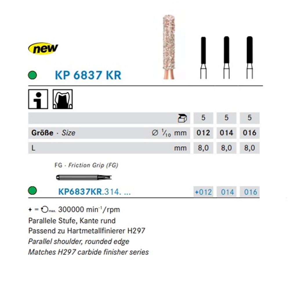 DIAO - KP6837KR is a parallel shoulder rounded edge shaped coarse, friction grip diamond used for Cavity Preparation. Head diameter 014 (1.4mm) and 8.0mm working length.