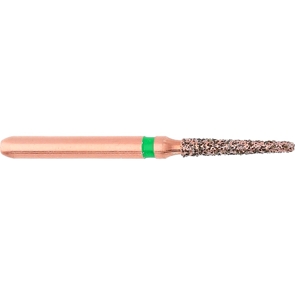 DIAO - KP6847KR is a tapered rounded edge shaped coarse friction grip diamond used for crown preparation. Head diameter 014 (1.4mm) with 8mm working length and 2 degree angle.