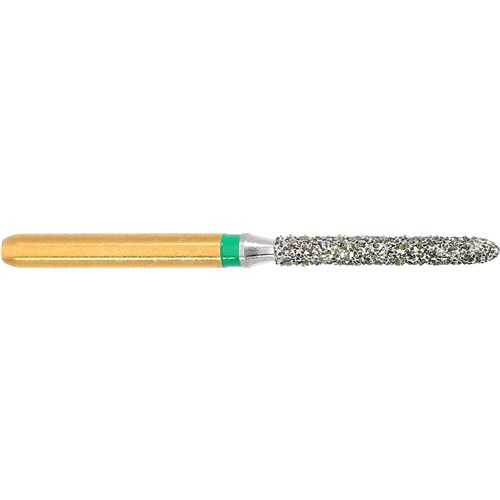 The S6879 is a long parallel chamfer torpedo (green) grit bur used for crown preparation.
