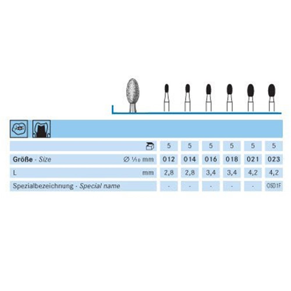 379 is medium grit diamond, football/egg shaped diamond bur used for occlusal adjustments in crown and bridge technique used in laboratory handpiece. HP 104 shank. Head Diameter size = 023 (2.3mm). Working Length of Diamond Grit Part = 4.2mm.