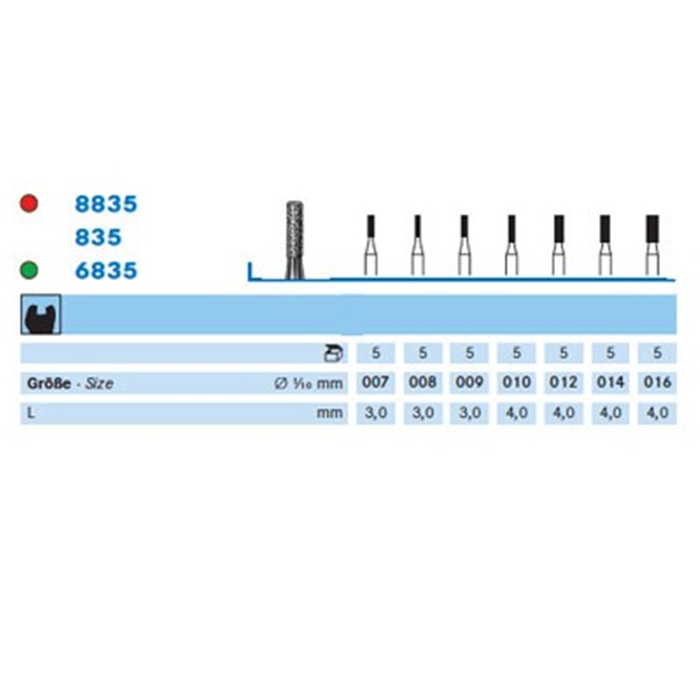 Cylinder short, sharp edge lab handpiece diamond. Head diameter 010 (1.0mm) and 4mm working length. Maximum recommended speed 100,000rpm.