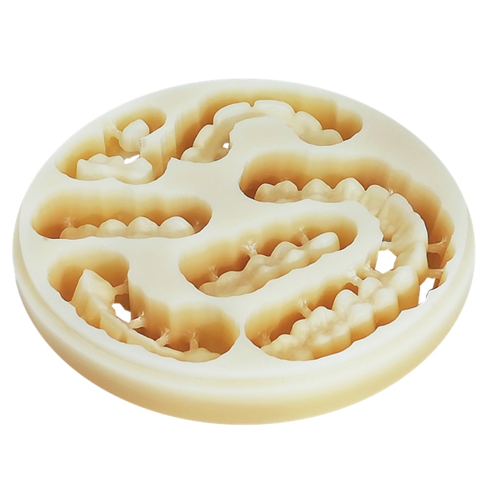 Multi-layered, pre-coloured PMMA discs for making temporary crowns and bridges.