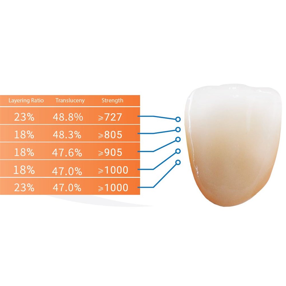 This transitional innovation enables dental technicians to mill restorations that exhibit high translucency along the incisal edge while maintaining the required strength and opacity along the margin and body.