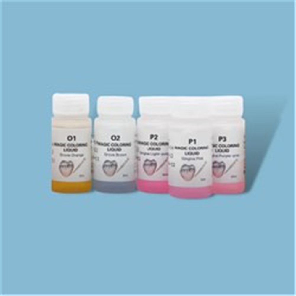 Aidite Magic Colouring Liquids are available in the following colours: Incisal colours - liquid blue (T1), light grey (G1), grey (G2), dark grey (G3), tooth fossa - orange (O1), dark orange (O2), gingiva colour - pink (P1), light purple (P2), purple pink (P3).
