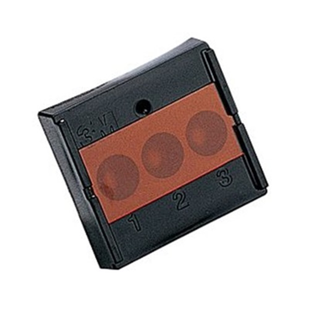 A reusable, 3 hole dispenser with a sliding cover designed to protect adhesive contents from exposure to light.
