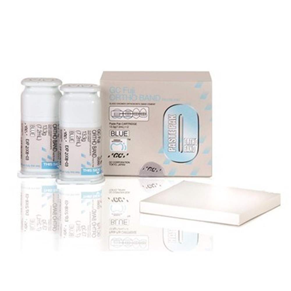 Fuji ORTHO BAND Paste Pak is a blue, resin modified glass ionomer for bonding orthodontic bands. It can also be used for the cementation of appliances retained with stainless steel crowns (ex: Herbst or expansion appliances).