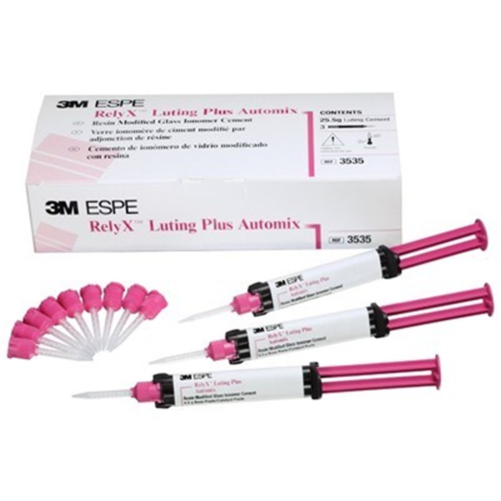 •   Final cementation of PFMs, metal crowns and all-alumina or all-zirconia strengthened core ceramic restorations to implant abutments RelyX Luting Plus cement offers paste/paste delivery from the doublesyringe Automix dispenser for 1:1 dosing and easy mixing. RelyX Luting Plus cement delivers: