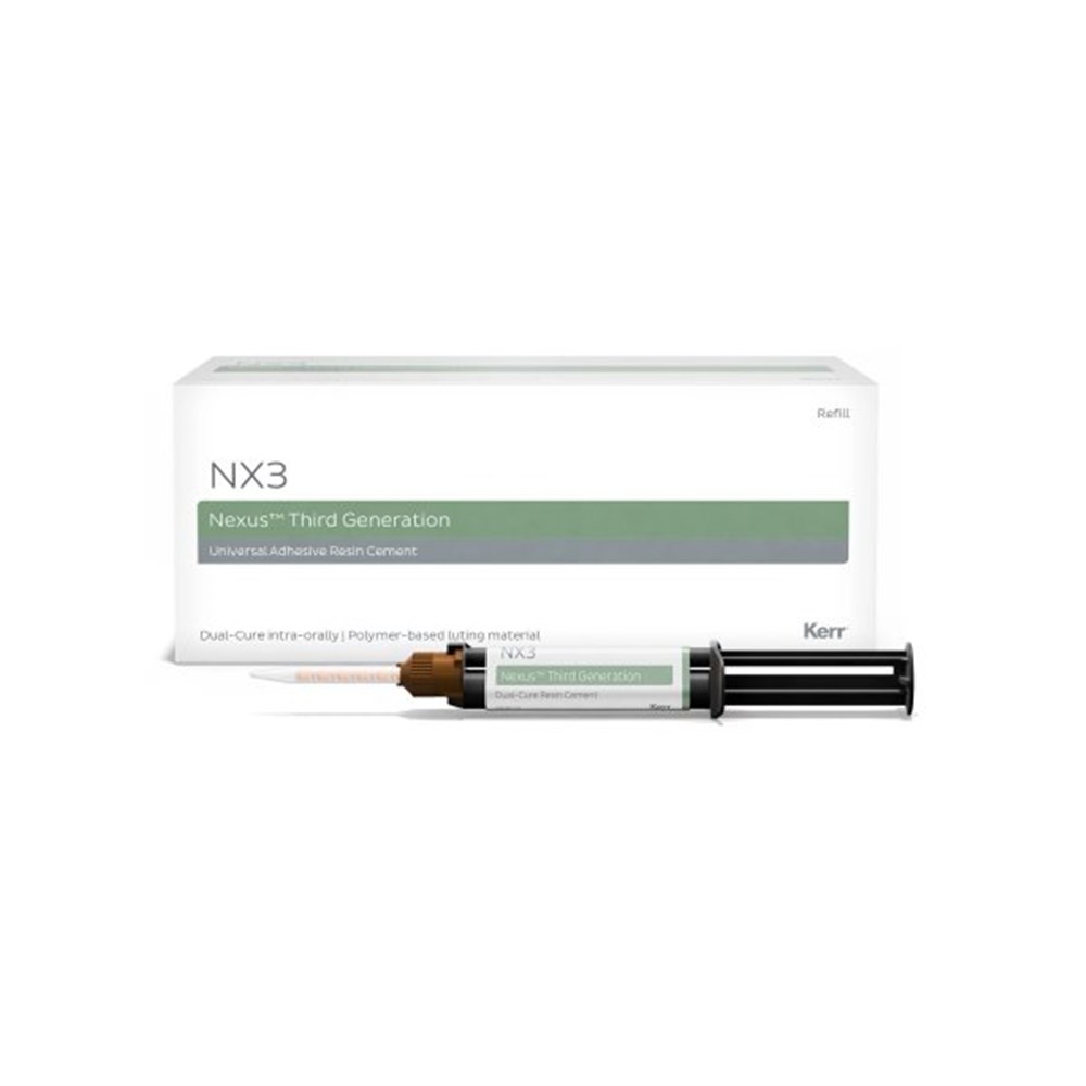 Universally indicated for all indirect applications, NX3 Nexus Third Generation is a permanent resin cement system with an innovative chemistry for unmatched esthetics, adhesion and great versatility. Delivery system choices include an automix syringe for dual-cure indications and a light-cure cement for multiple units where unlimited work time is needed. The automixing dual-cure cement can be used for all indirect applications, including veneers. With Kerr’s proprietary amine-free initiator system and optimized resin matrix, NX3 is the first truly colour-stable adhesive resin cement.