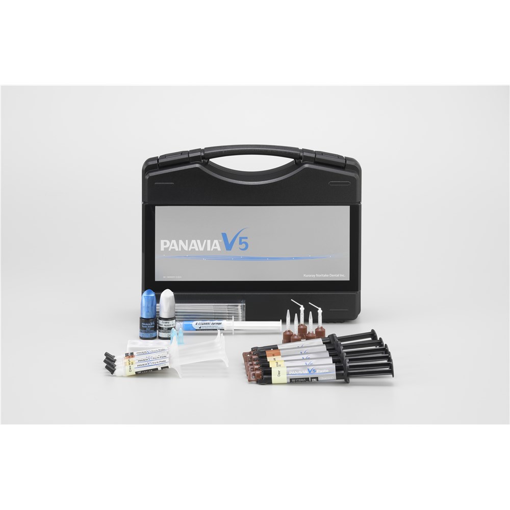 PANAVIA™ V5 is an Esthetic, adhesive resin cement system. PANAVIA™ V5 consists of the cement paste, try-in paste, PANAVIA™ V5 Tooth Primer, CLEARFIL™ CERAMIC PRIMER PLUS and K-ETCHANT Syringe. The paste is a dual-cure (light-cure and/or self-cure), fluoride-releasing, radiopaque resin cement for ceramics (lithium disilicate, zirconia, etc.), hybrid ceramics (e.g. ESTENIA C&B), composite resins, and metal restorations. It is supplied in an automix delivery system which simply mixes equal amounts of two paste components. It is available in the following 5 shades; Universal (A2), Clear, Brown (A4), White and Opaque. The Opaque shade should be self-cured for final curing due to its high opacity. The try-in paste is a shade matching material which has approximate colour and transparency as the cured mixture of paste. The PANAVIA™ V5 Tooth Primer is a self-etching primer to tooth structures that also accelerates the polymerization of the paste upon contact. CLEARFIL™ CERAMIC PRIMER PLUS is a universal dental prosthetic primer that provides an enhanced adhesive surface to ceramics, hybrid ceramics, composite resins and metals. K-ETCHANT Syringe is an etchant gel that consists of 35% phosphoric acid in an aqueous solution with colloidal silica.