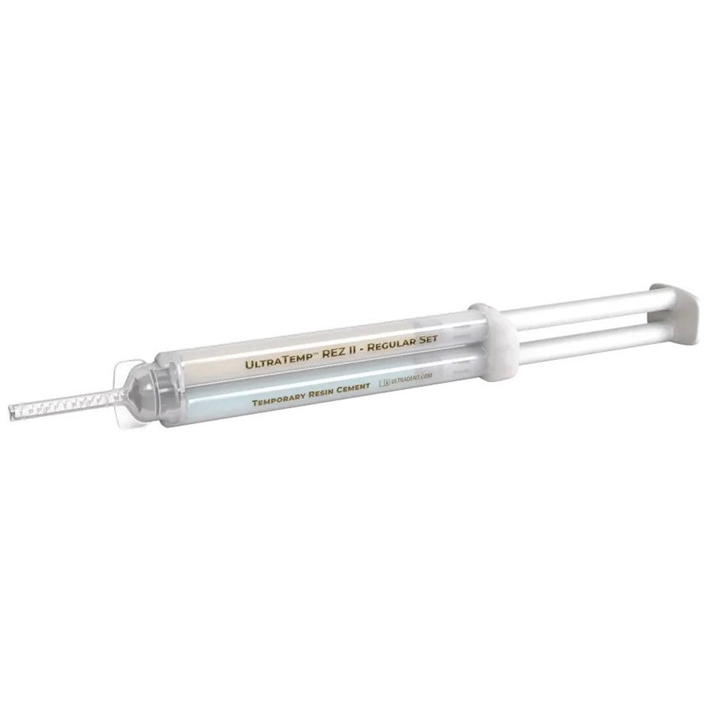 UltraTemp™ REZ II temporary cement is a hydrophilic, resin-based chemistry that helps ensure low irritation and a quality seal. It was developed for longer retention needs (2–4 weeks) and comes in a dual-barrel syringe with mixing tips for easy delivery. Available in Fast Set (1–2 minutes) or Regular Set (2–3 minutes).
