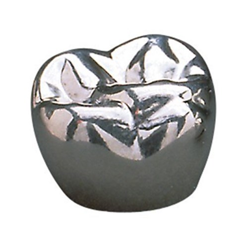 Prefabricated crowns made of tin-silver alloy for short-term adult posterior use.