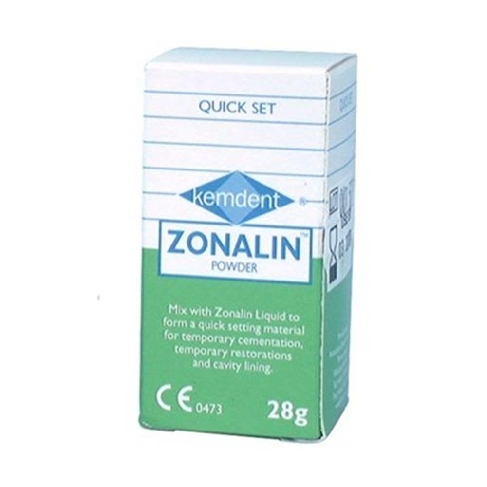 Zonalin is a modified accelerated setting zinc oxide eugenol cement which conforms to ISO 3107. Mix zonalin powder and zonalin liquid together to form an economical temporary restoration, base or cementation of crowns, bridges. onlays, inlays, orthodontic bands and brackets. The mixture is also used for cavity linings under amalgam and silicate restorations, for pulp capping (to protect the pulp from thermal change and acid irritation of cements) and as a temporary seal for medicament dressings. Do not use as a base for composite restorations.