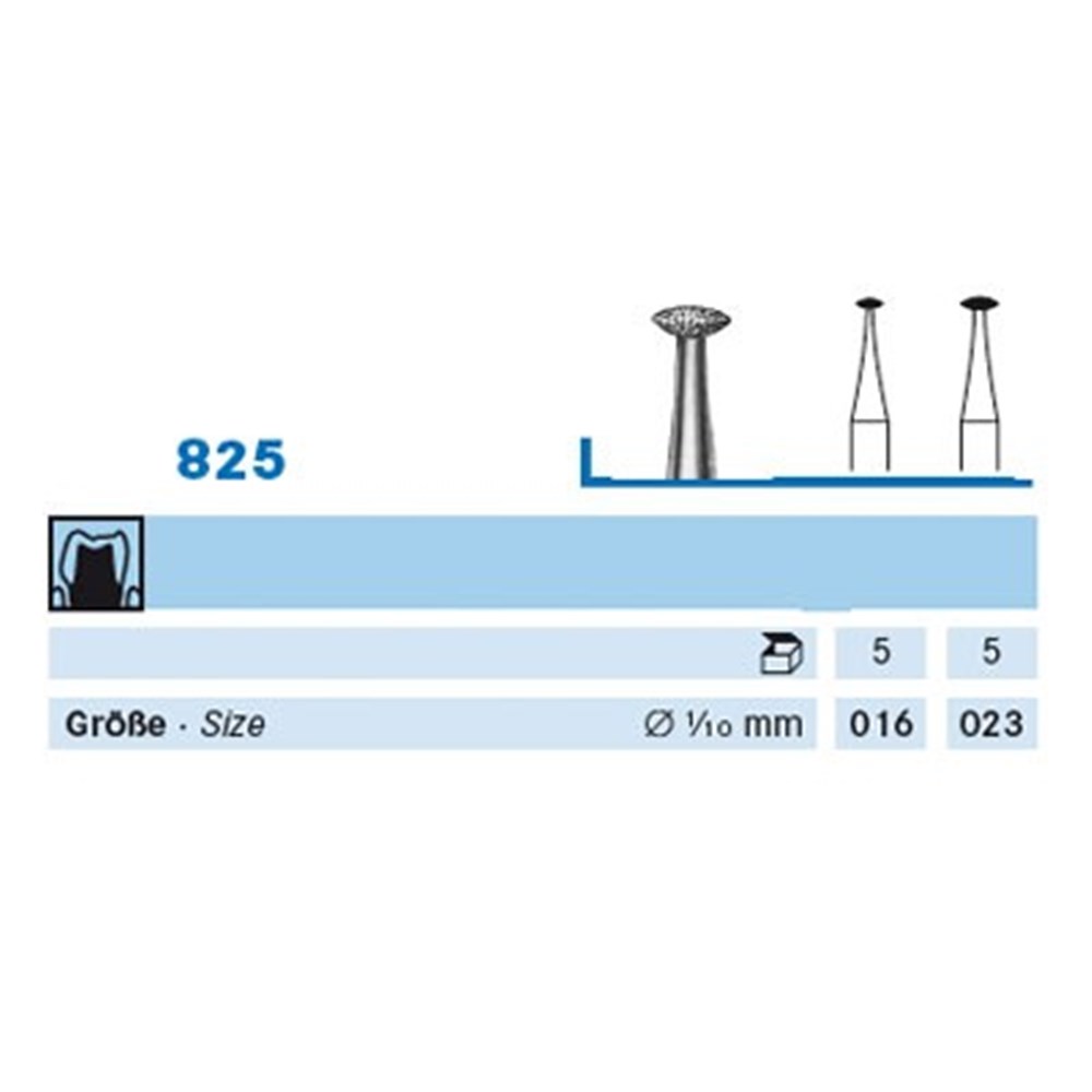 825, knife edge medium grit diamond lab handpiece HP 104 shank. Head diameter 023 (2.3mm). Maximum recommended speed 100,000 rpm.