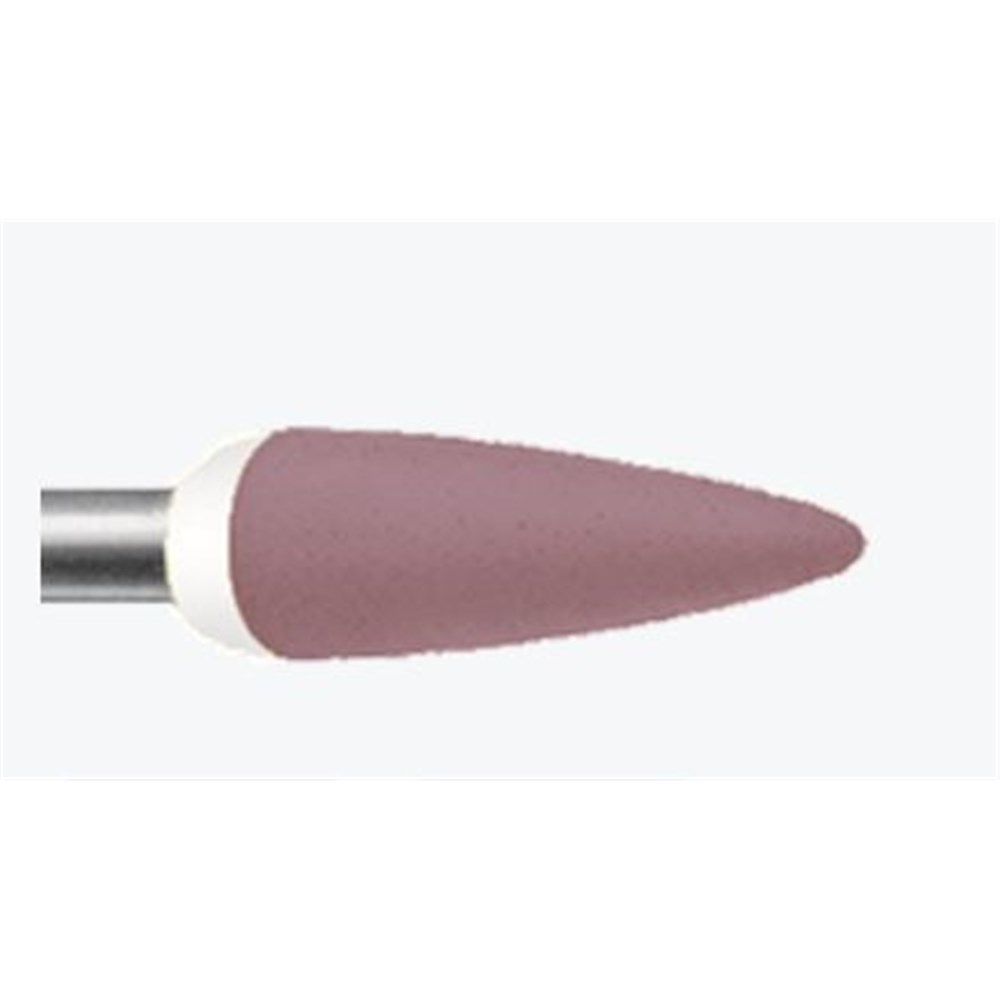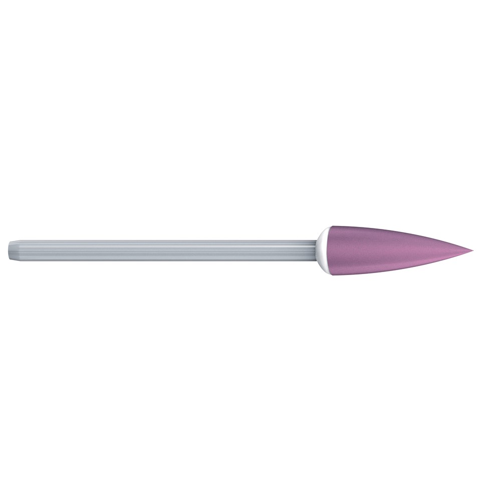 Pink medium polisher for ceramics interspersed with diamond grit for trimming, polishing and high shine polishing. HP shank 104, size .055 wit 16.5mm working length.